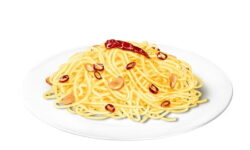納豆パスタに添えたいのは、生卵、ご飯ですよ、食べるラー油。