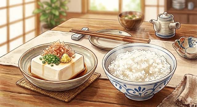 出汁で煮含めた豆腐をご飯に乗せて食べるのは